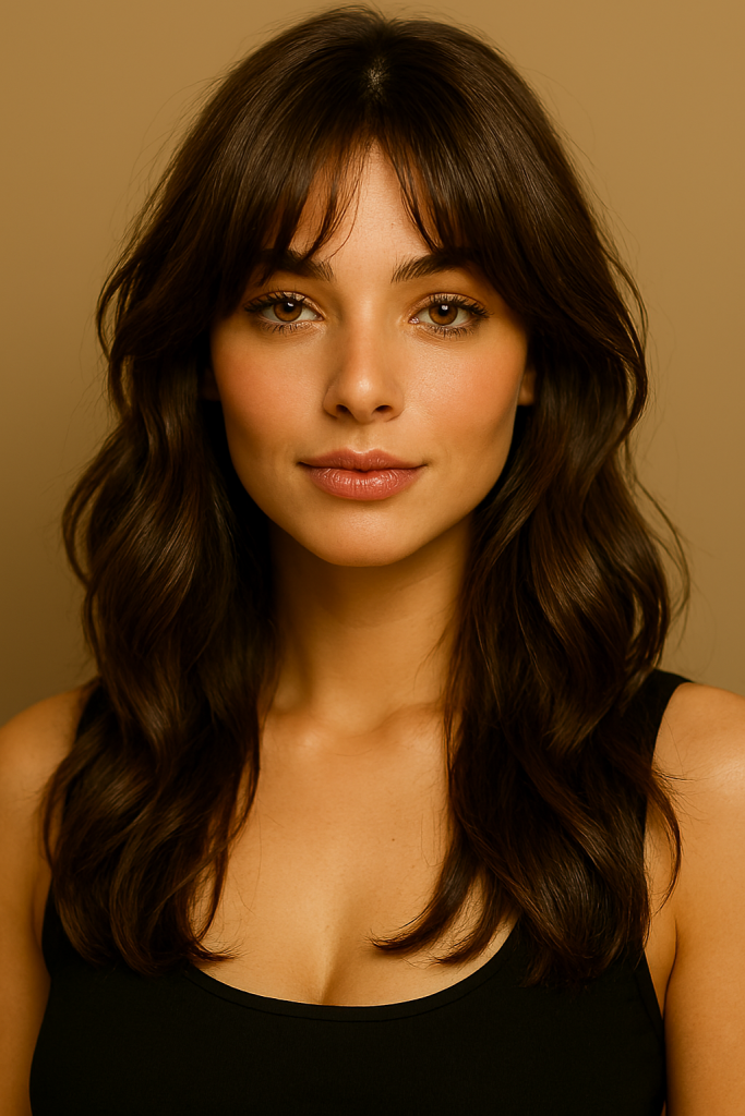 | Curtain Bangs | Soft parted fringe and volume crown | Sultry, mapped gaze |